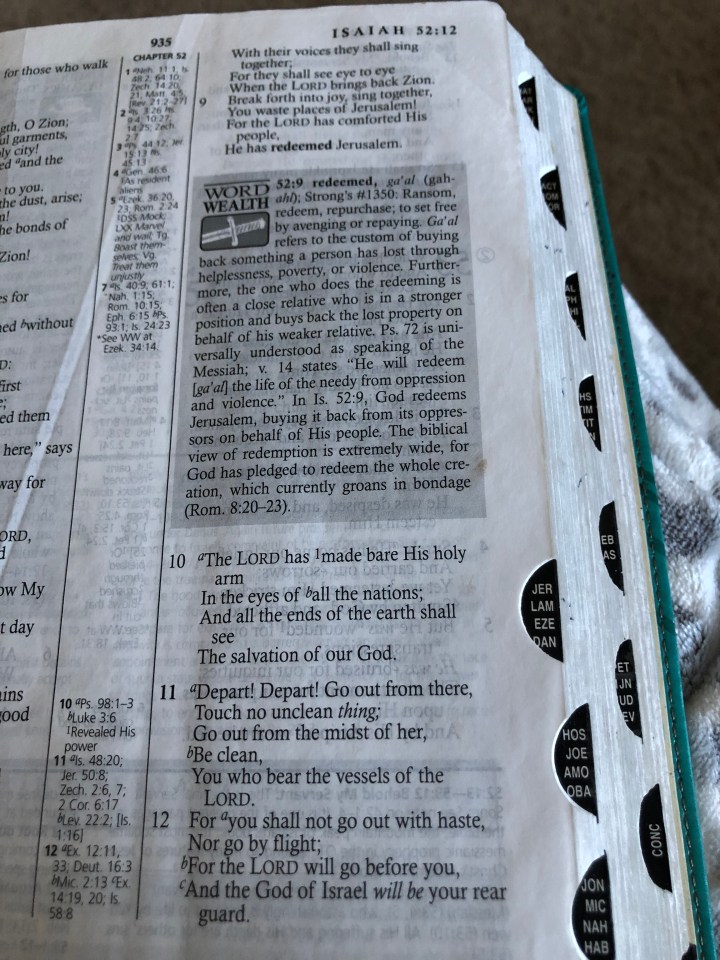 Strong’s Concordance– ransom, redeem, repurchase, to set free by avenging or repaying. Ga ’al refers to the custom of buying back something a person has loss through helplessness, poverty, or violence. Furthermore, the one who does the redeeming is often a close relative who is in a stronger position and buys back the lost property on behalf of his weaker relative.